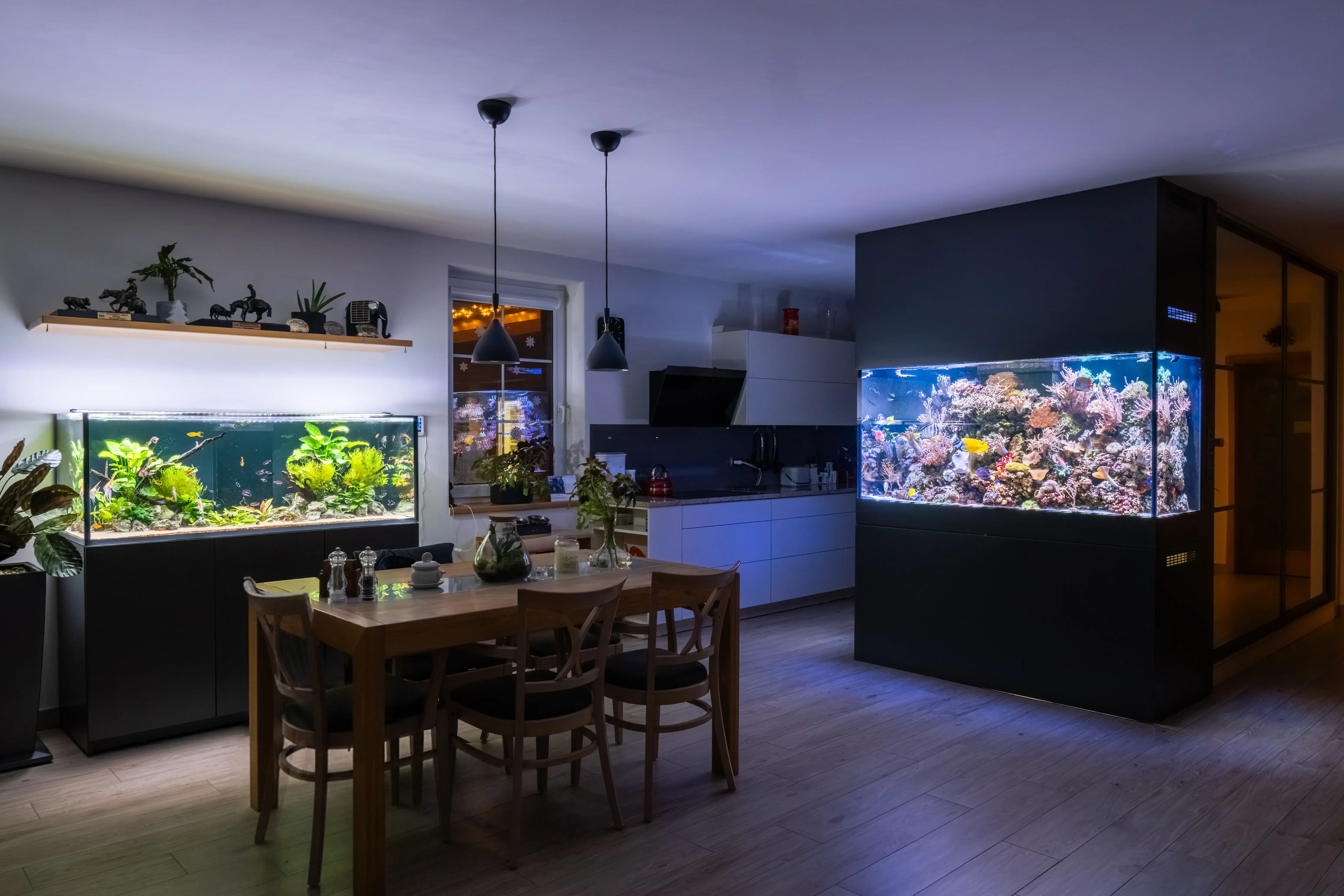 Sladkovodní akvárium nabízí klid, přirozenost a jemnou přírodní a rostlinnou eleganci, ideální pro harmonické interiéry. Mořské akvárium je naopak živým uměleckým dílem. Plné sytých barev všech odstínů, pohybu a fascinující biodiverzity. Každý typ má své kouzlo, technické nároky i estetický charakter. Pomůžeme vám vybrat řešení, které bude odpovídat vašemu prostoru i představám.